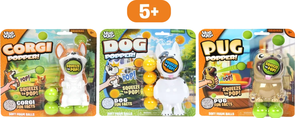 Dog Squeeze Poppers are playful pups that bring the pop to playtime. Simply load a soft foam ball, give their belly a squeeze, and watch as they shoot the ball for you to fetch!