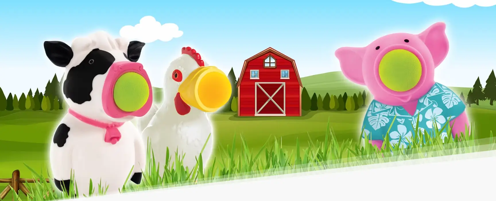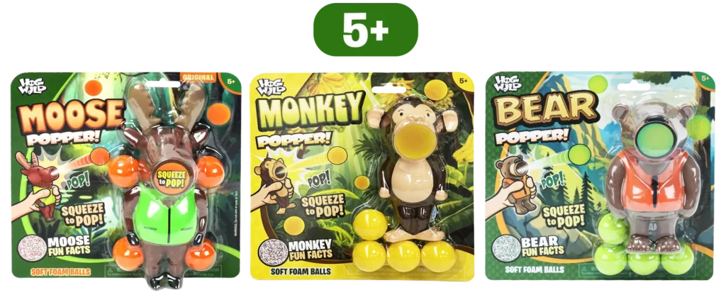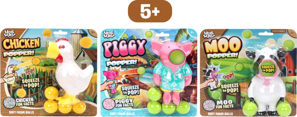 Meet the Farmyard Poppers! This trio of barnyard buddies Chicken, Pig, and Moo is ready to turn any room into a riot of laughter. Just load up your favorite friend, give a playful squeeze, and POP! a soft, foam ball will fly up to 20 feet. It’s no yolk, this farmyard fun is a total blast!