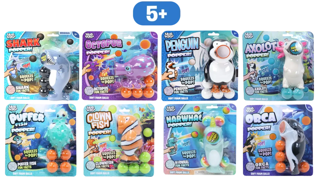 Dive deep into a world of fun, from the icy Arctic to vibrant tropical waters. Just choose your aquatic buddy, give it a squeeze, and POP! watch as soft foam balls fly up to 20 feet. No batteries required, just pure, kid-powered fun! With a collection featuring a narwhal, clownfish, shark, orca, octopus, penguin, and pufferfish, you’ll want to collect them all.