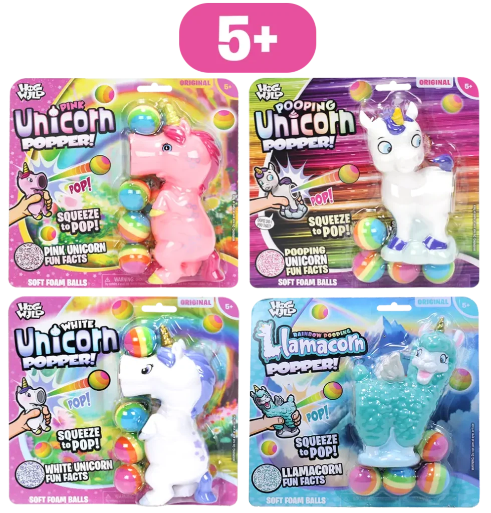 Choose from: Pink Unicorn, White Unicorn, Pooping Unicorn, and Llamacorn