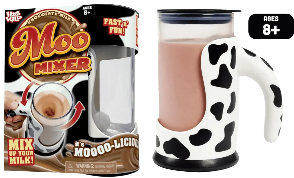 Meet the Moo Mixer, where cool styling meets effortless functionality. With its easy-to-use trigger button, you can whip up perfectly blended chocolate milk in seconds just push, mix, and watch the magic happen! The large, clear tumbler lets you see the swirling vortex transform milk and syrup into a delicious concoction every time. The comfortable, easy-to-hold handle makes it perfect for kids and adults alike. Get ready to mix it up with the Moo Mixer and make every sip a delightful, mess-free experience!