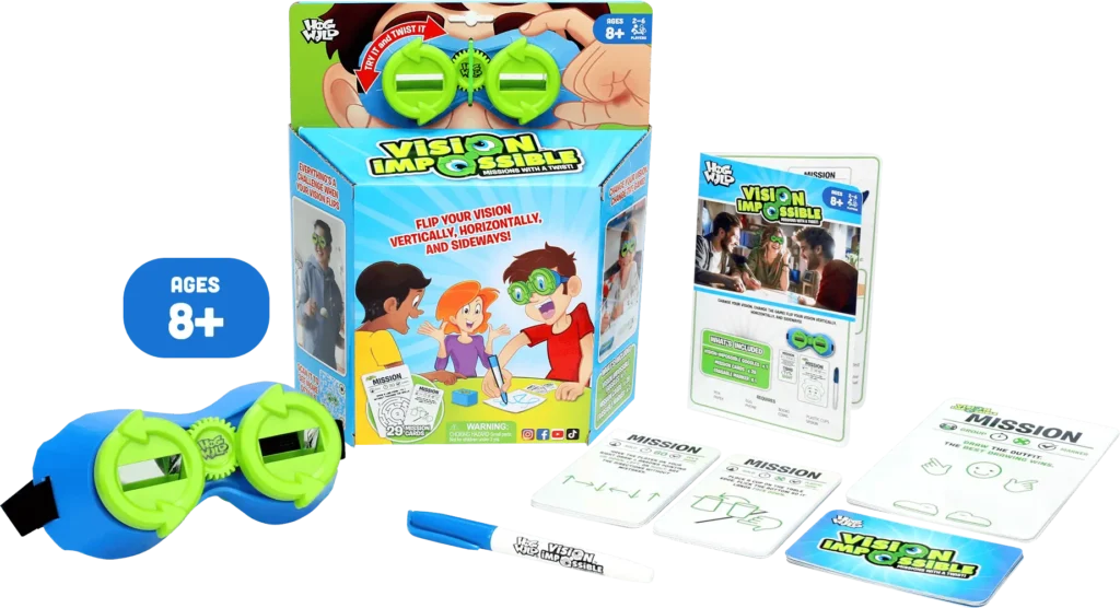 Box includes: 1x Vision Impossible Googles, 29x Mission Cards, and 1x Erasable Marker