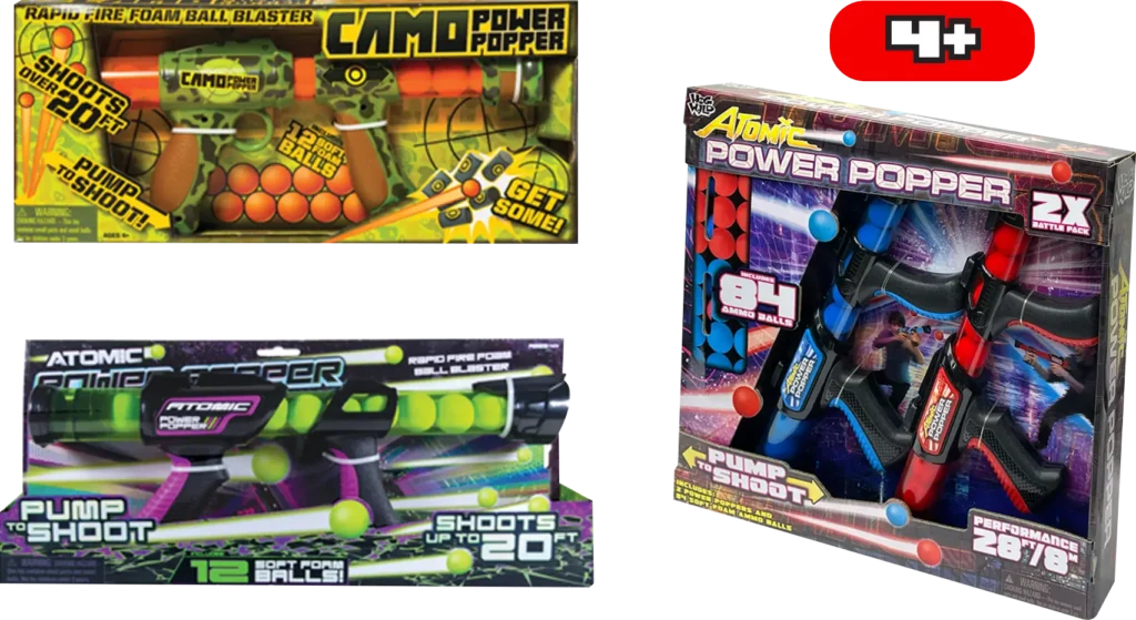 Lock, load, and prepare for rapid-fire domination! Atomic Power Poppers deliver a high-velocity payload of soft foam, with the pump of your hand fueling every incredible shot.