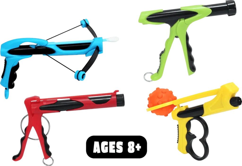 Micro Blaster X-Bow: Stealthy mini crossbow. Fires cotton swabs 20+ feet. Sneaky, satisfying, ridiculously fun.